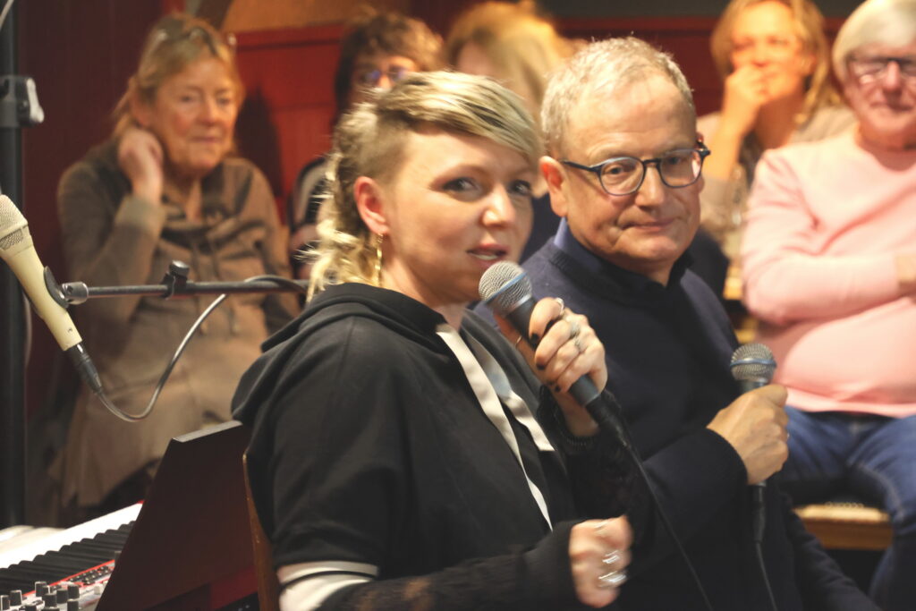 Cindy Weinhold, Multitalent und Leiterin Schauspielmusik am Volks-theater, war zu Gast bei rund 60 Vereinsmitgliedern in der Theaterbar, erzählte, sang und spielte.