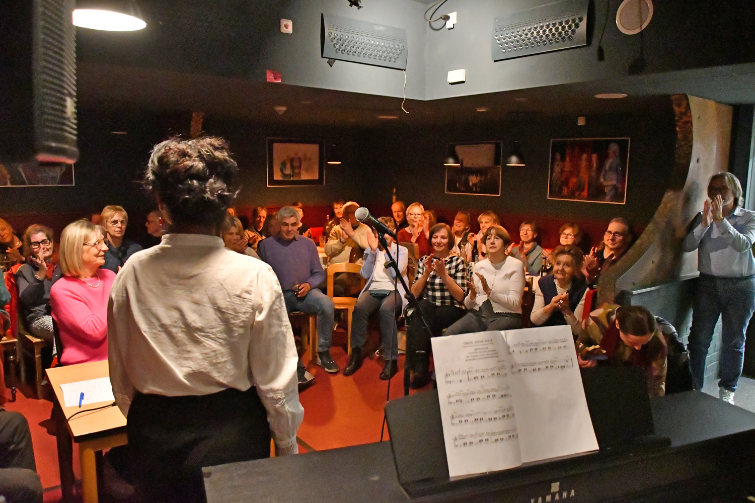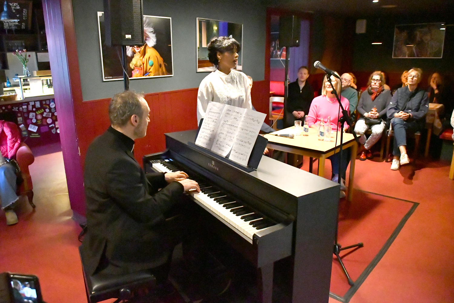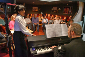 Dass ihre Stimme sich auch solo gut hören lässt, demonstrierte sie eindrucksvoll anhand zweier Gesangseinlagen, die sie, durch Ralph Zedler begleitet am Klavier, am Beginn und Ende des Interviews gab. Wir hörten ein Stück von Heitor Villa-Lobos, das brasilianische Folklore verarbeitet und zum Abschluss einen Bolero.