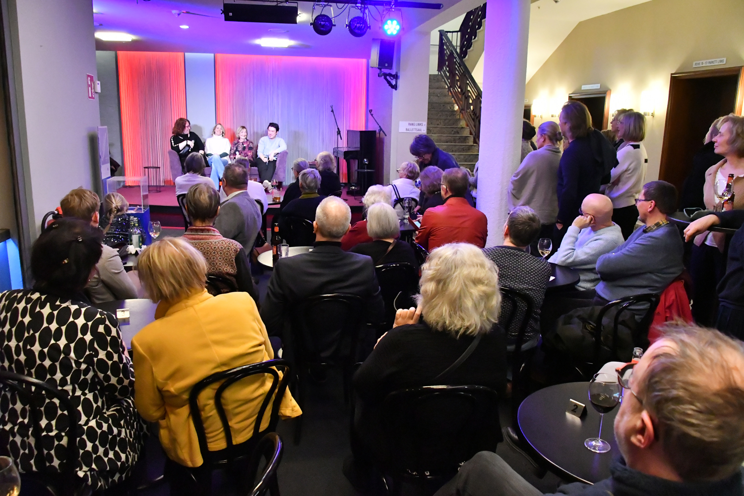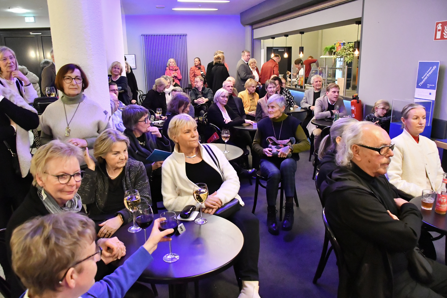 Ein herzlicher Dank gilt allen Beteiligten vom Theater, der Theaterbar und des Theaterfördervereins für die Unterstützung des Nach-Spiels. Das Kleine Foyer war erneut voll besetzt, sodass sich im Anschluss an die Gespräche auf der kleinen Bühne ein reger Austausch über die Inszenierung im Besonderen und das Theater im Allgemeinen entwickeln konnte.