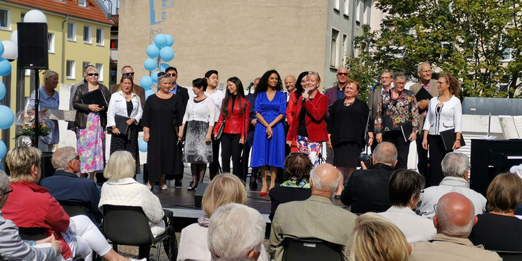 Am 8. September schien die Sonne, das tat sie ausgiebig und zum richtigen Zeitpunkt. Auf dem Theatervorplatz ging nämlich das Fest zur Eröffnung der neuen Spielzeit 2019/2020 über die Bühne. Letzteres ist wörtlich zu nehmen. Unter freiem Himmel traten viele Theaterkollegen auf: Schauspielerinnen und Schauspieler, Sängerinnen und Sänger, Musikerinnen und Musiker sowie  Tänzerinnen und Tänzer. Ein buntes Programm unterhielt die vielen Gäste, die es sich auf den Bänken, Stühlen und Liegestühlen bequem gemacht hatten. Nicht zu übersehen: die schönen Rosenbeete in Rot und Weiß, die auf das Aktionskonto unseres Vereins gehen.