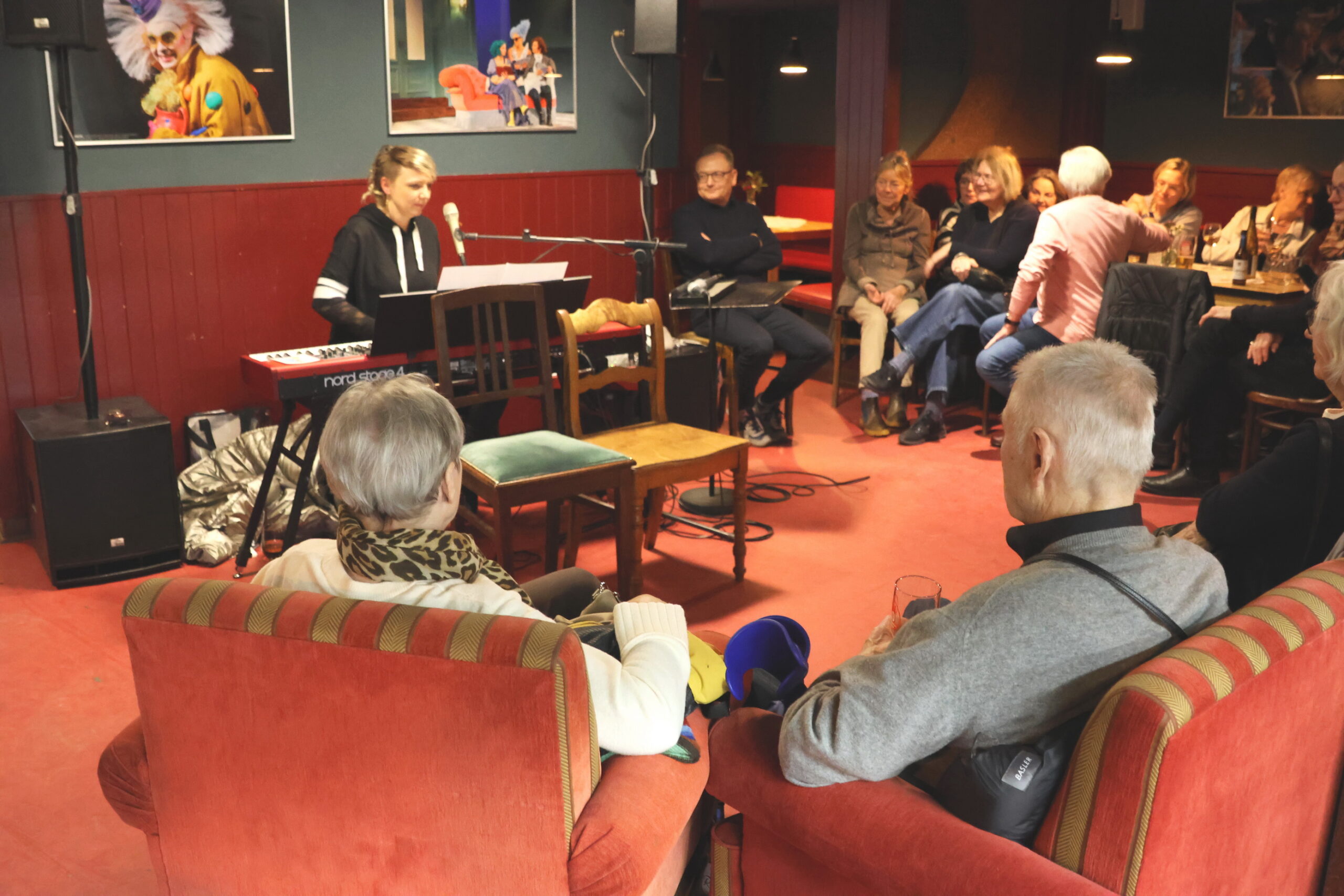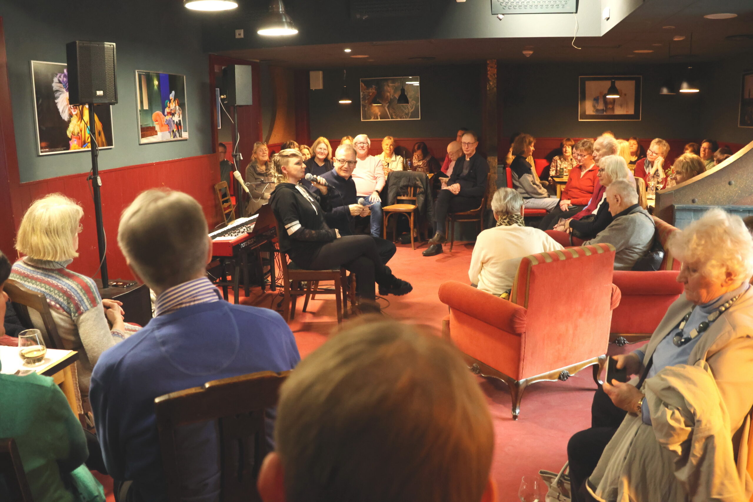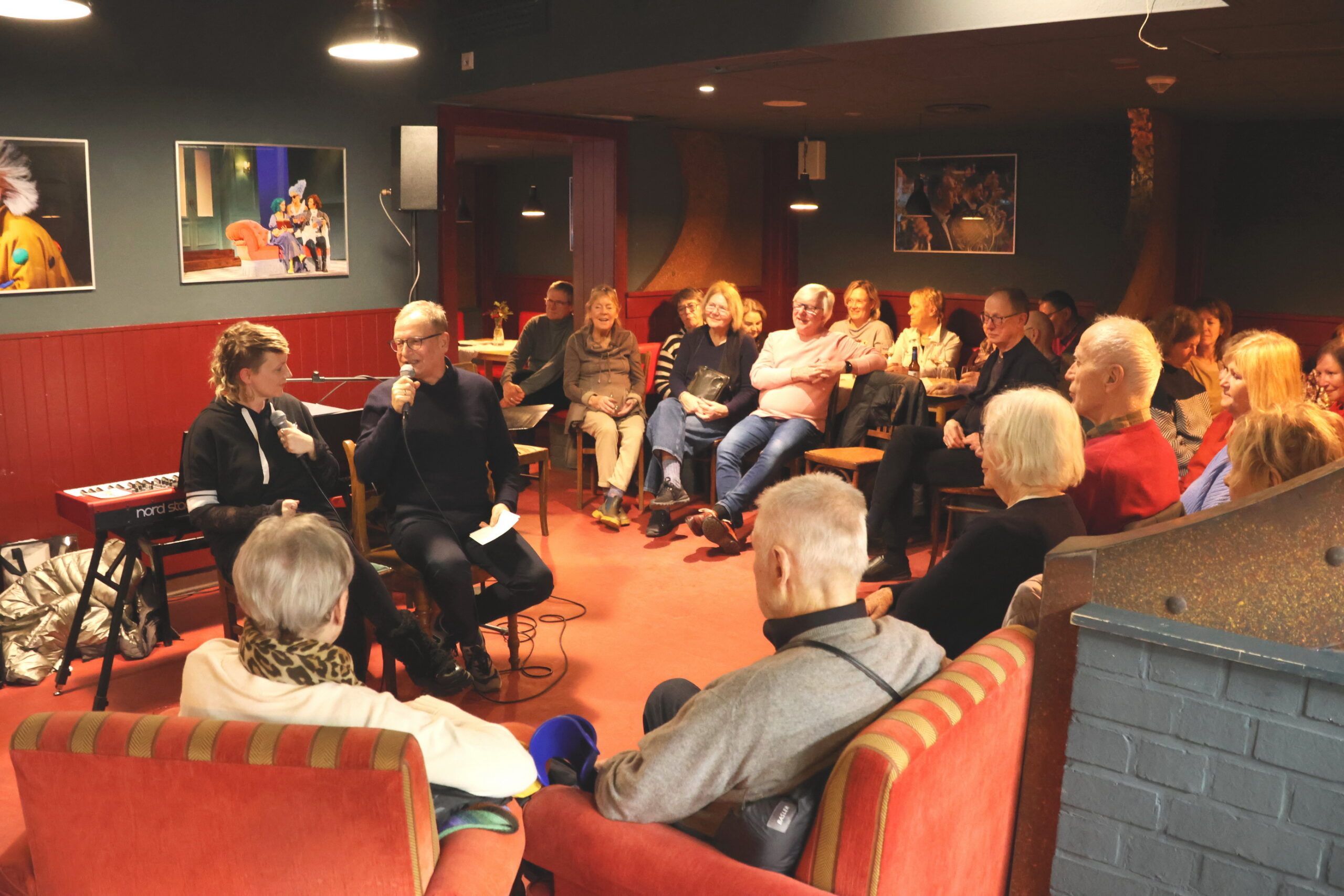 Wir erfuhren dann im Interview Vieles aus Cindys Leben, nach dem Studium von Germanistik, Schulmusik und Philosophie folgte noch ein Jazzjahrgangsstudium in Weimar. Ihre große Liebe gilt dem Jazz – aber nicht nur: Cindy Weinhold bezeichnet sich selbst als „Theaterchamäleon“ – sie ist Sängerin, Multi-Instrumentalistin, Arrangeurin und Komponistin. Neben Ihrem Engagement in Rostock ist sie auch in vielen anderen Theatern und Veranstaltungen aktiv. In Rostock steht sie auch auf der Bühne und führt zuweilen auch Regie – beim demnächst anstehenden „The Black Rider (Premiere am 11.04.2026) ist sie zuständig für Arrangement und musikalische Einstudierung.